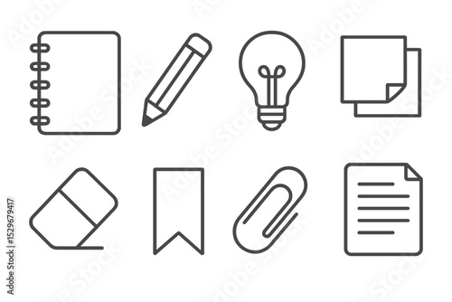 Line Style Icons. Line style icons for notes and ideas: notebook, pencil, light bulb, sticky notes, eraser, bookmark, paperclip,
