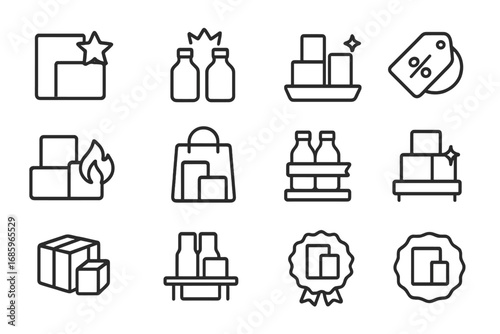 Line Style Icons. Line style icons of top bundles: combo pack with star, product pair with crown label, bundle tray with spark,