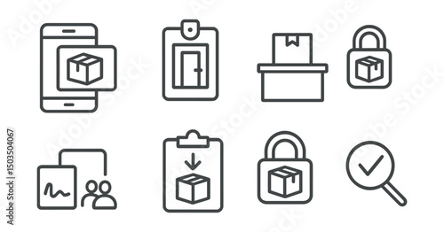Line style icons of delivery support: delivery photo proof icon, front door photo badge, left at reception symbol, package with signature, drop-off instructions icon, secure location icon, neighbor