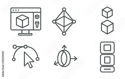 Line style icons of digital creativity: 3D modeling workspace icon, geometric mesh symbol, wireframe cube badge, extrusion tool icon, surface smoothing tool, vertex editing pointer, 3D object