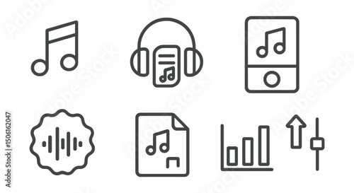 Line style icons of entertainment and media: music note icon, sound wave badge, headphones with playlist, music player screen, equalizer panel symbol, audio file tag, top charts icon, volume