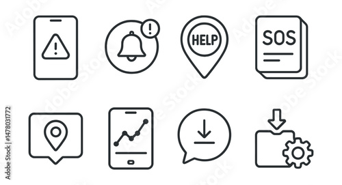 Line style icons of mobile emergency apps: crisis icon on homescreen, one-tap alert badge, GPS help tag, quick SOS file, send my location board, app with red dot chart, offline backup bubble, install