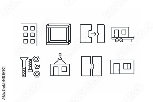 Line style icons of modular building: prefab panel, steel frame, module connection, transport trailer, fastener kit, crane lift, panel joint, finished module.