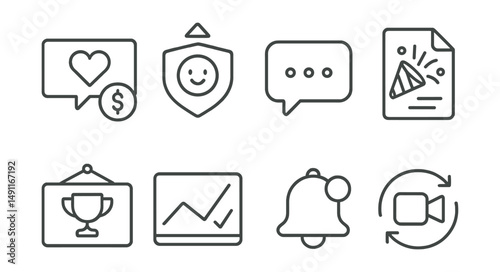 Line style icons of stream alerts: donation alert icon, follower alert badge, message pop-up tag, milestone celebration file, achievement notification board, goal reached chart, alert notification