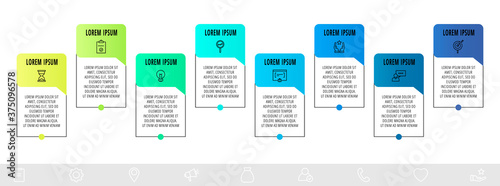 Line vector infographic design with 8 dialogs, icons. Template used for diagram, business, web, banner, flowchart, info graph, timeline, content, levels, chart, processes diagram. Data visualization.