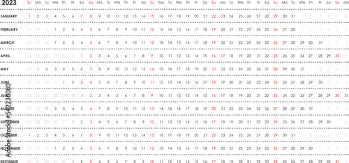 Linear calendar for 2023. Horizontal, black and white, English.