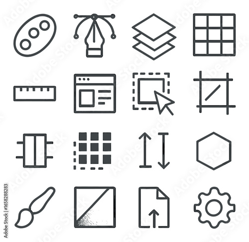 Linear design icon set featuring palette, pen tool, layers, grid, ruler, browser, crop, hexagon, brush, gear