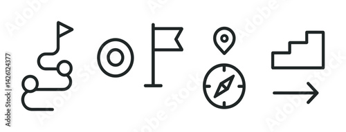Linear navigation icons set: path, target, flag, location, compass, stairs, arrow