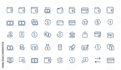 Linear wallet icon pack featuring outline purse, billfold, payment, money transfer, bank card, credit, and pay symbols. Editable vector pictogram in modern linear style, finance banking and more.
