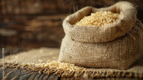 Linen sack containing brown rice, calm and earthy tones, on a brown wooden top table, warm and rustic feel