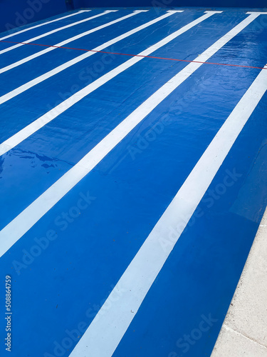 lines of the bottom of a half filled blue pool with a composition with the lines of the roads vanishing point, vertical