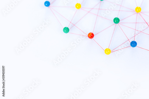 Linking entities, Blockchain, social media, Communications Network, The connection between the two networks. Network simulation on paper linked together by yarn