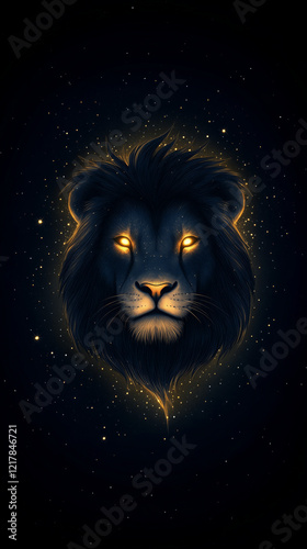 Lion head with glowing golden eyes surrounded by a starry night sky creating a mystical atmosphere