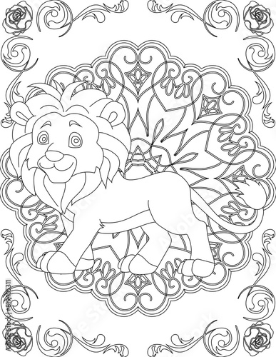 Lion on Mandala Coloring Page. Printable Coloring Worksheet for Adults and Kids. Educational Resources for School and Preschool. Mandala Coloring for Adults