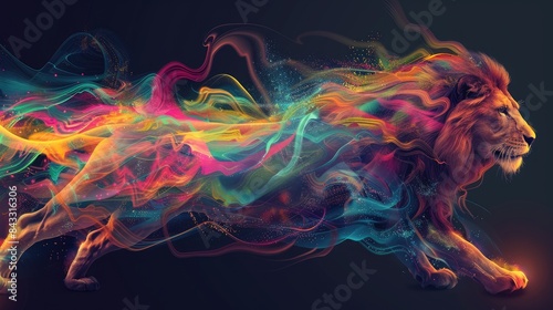 Lion silhouette becoming one with vibrant, surreal designs and stunning bright colors, creating an abstract and imaginative visual experience.