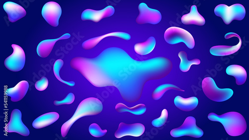 Liquid flow glow purple, blue 3D neon lava lamp vector geometric set for banner, card or UI design. Gradient mesh bubble in the shape of a wave drop. 31 Fluid colorful abstract shapes collection