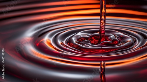 Liquid pours, creating ripples and concentric circles on a dark surface. Intense, vibrant colors
