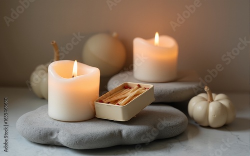 Lit Candle and Matchbox on Gray Stone with Beige Accents. High quality