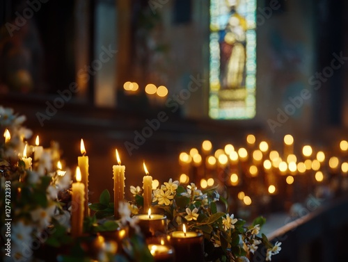 Lit candles illuminating a religious ceremony, symbolizing faith and community.
