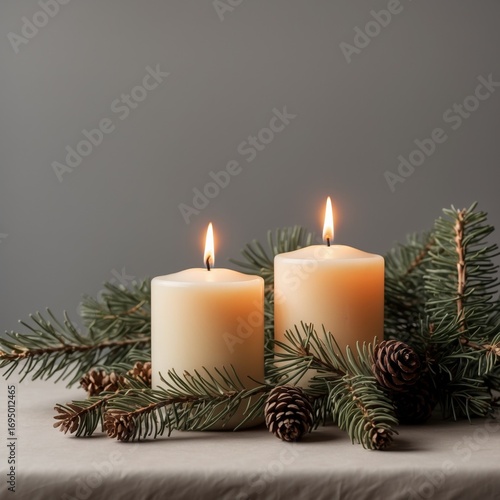 Lit candles with pine branches, minimal winter holiday studio photo.