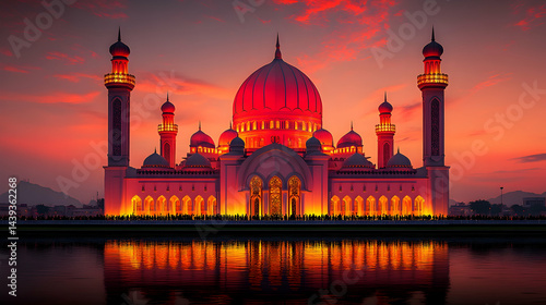 Lit mosque with dome towers at sunset reflected on water crowd visible in front of the building