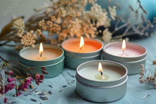 Lit scented candles surrounded by a tranquil floral arrangement on a soft background