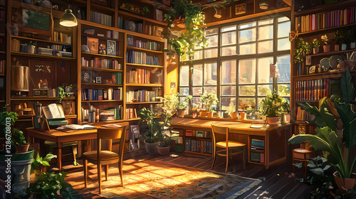 Literary Haven: A sunlit library, overflowing with books, inviting to the imagination and serenity, plants and a large window frame, evoke a sense of intellectual curiosity and calm