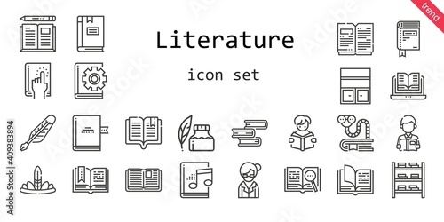 literature icon set. line icon style. literature related icons such as bookworm, audiobook, open book, bookshelf, feathers, book, ink pen, reading, librarian, quill,