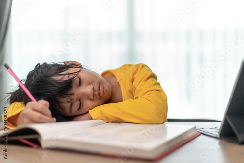 Little Asian girl sitting alone and looking out with a bored face, Preschool child laying head down on the table with sad bored with homework, spoiled child
