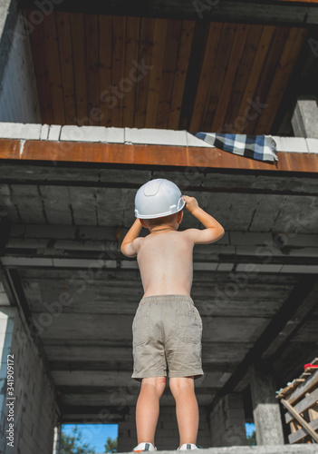 little boy in brown shorts and a helmet stands at a construction site and looks up at the house under construction