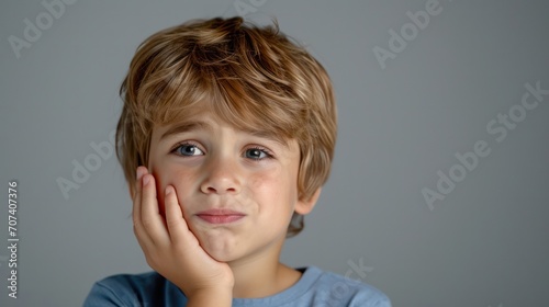 little boy presses hand to cheek, suffers from pain in tooth isolated on gray studio background. Teeth decay, dental problems, child emotions and facial expression