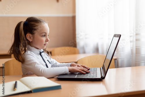 little cute smiling girl of 7 years old, a first grader, sitting in the audience at her desk. The laptop is on the table.