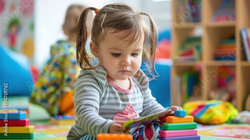Little Girl Playing with Colorful Blocks