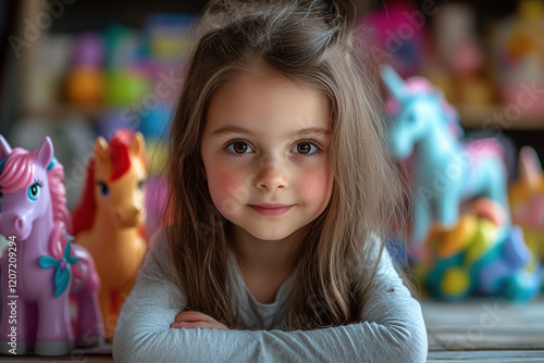 Little girl playing with little ponies on table in nursery. Educational game. Learning through play. Generated by artificial intelligence