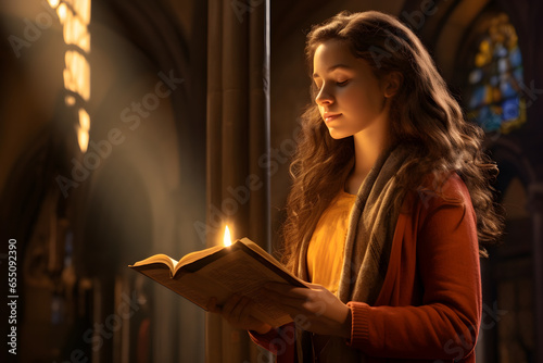 Little girl reading holy bible book. Worship at church.