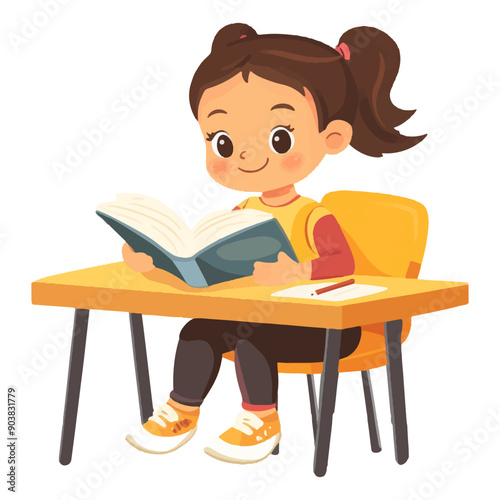little girl sitting at the table reading a book School isolated on white background in cartoon style.