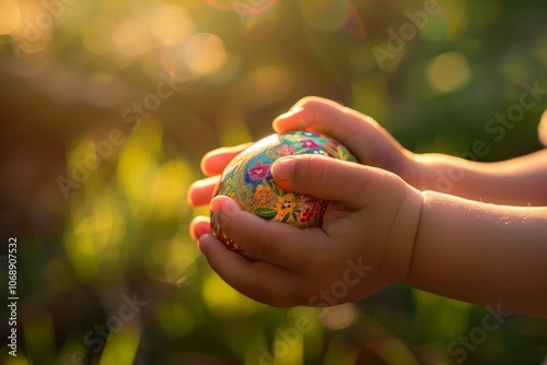 Little Hands Holding a Decorated Easter Egg. AI generative