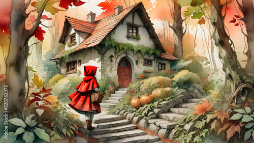 Little Red Riding Hood in the forest with a basket and a wolf