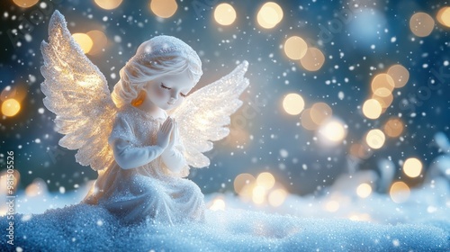 little white guardian angel in snow on shiny lights background. christmas decoration transparent background