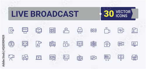 Live Broadcast collection. Includes thin line stream, podcast, social, live, camera, play, record and more. Pixel perfect. Vector icons editable stroke.