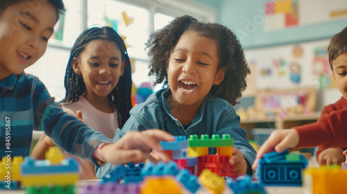 Lively children joyfully build with colorful bricks in a bright classroom, capturing the essence of creativity and collaboration in play.