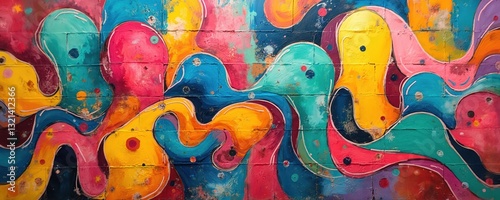 Lively, colorful mural filled with abstract patterns, shapes. Component intertwines to create vibrant composition. Decorative multicolored layers blend. Wallpainting featuring creative urban