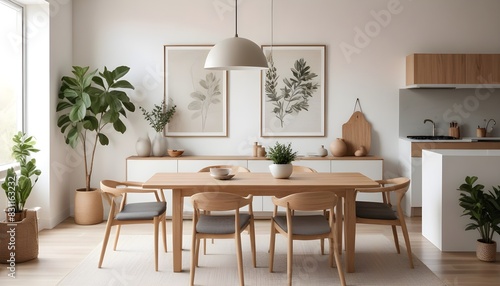 Living room of dining room interior with mock up poster frame, stylish table, rattan chair, wooden kitchen island, plants, kitchen hood and personal accessories. Home decor. Template. 3D Render