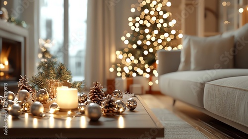 Living room with colorful Christmas lights and DIY ornaments, creative holiday spirit, 3D illustration