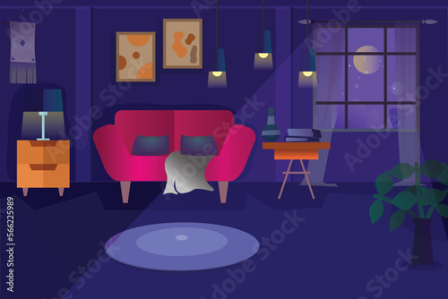 Living room with sofas at night vector cartoon dark lounge interior style boho illustrations.