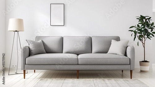 Livingroom interior wall mock up with gray fabric sofa and pillows on white background with free space on wall. 3d rendering. ai generative