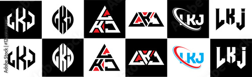 LKJ letter logo design in six style. LKJ polygon, circle, triangle, hexagon, flat and simple style with black and white color variation letter logo set in one artboard. LKJ minimalist and classic logo