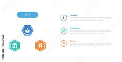LMS learning management system infographics template diagram with hexagon cycle circular with circle point stack with 3 point step design for slide presentation