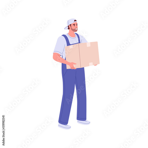 Loader worker carrying cardboard box. Courier holding carton parcel, packed order. Delivery man going with package in hands. Flat vector illustration of deliveryman isolated on white background