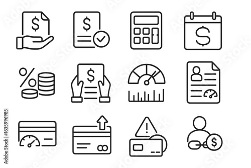 Loan and Credit Icons. Line style icons of loan and credit management: apply loan icon, loan approval, EMI calculator, monthly